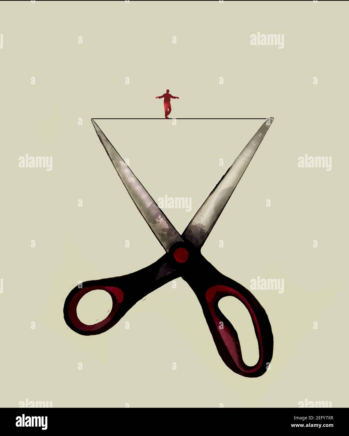 Seiltanzer Balanciert Auf Saite Zwischen Zwei Punkten Von A Schere Stockfotografie Alamy